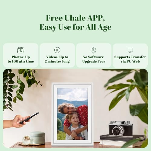 【No Fees APP – Easy Setup and Sharing】Simply connect the digital photo frame to WIFI, and you can invite unlimited friends to easily share photos (up to 100 pcs) or videos (up to 120 seconds) to the digital photo frame at a time through the ‘Uhale’ app. The frame has built-in 32GB memory and allows for the insertion of a SD card (max. 64GB) to expand storage. You can effortlessly and securely share numerous wonderful moments. Photos sent to the frame can be viewed without a WiFi connection. Also, upload photos from your computer to the frame via “Uhale” Web.