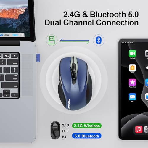【Multi-Device Connectivity】TECKNET’s rechargeable bluetooth mouse allows seamlessly connects to multi devices, laptops, desktops or tablets. Easily switch between devices with a single click of the wireless mouse. Offers 2.4G and Bluetooth 5.0 / 3.0 connection.