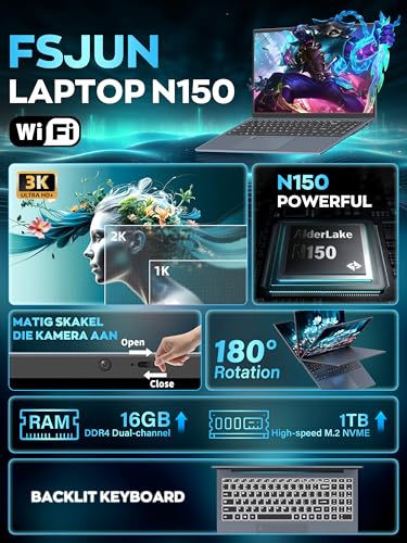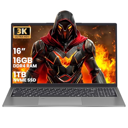16 inch Laptop Gray, 16GB DDR4 RAM, 1TB NVMe SSD, 4 Core N150 Up to 3.6GHz, 3K IPS Display (3072×1920) , Fingerprint Login, Backlit KB, HDMI, WiF, 6000mAh Battery, Notebook Computer for Work & School
