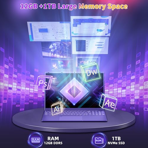 16″ Purple Laptop Computer, 12GB LPDDR5 RAM, 1TB NVMe SSD, N95 CPU up to 3.4 GHz, 2K FHD (1920 * 1200) IPS Screen, Color Backlit Keyboard, Fingerprint, Notebook PC for Business Travel Work Study