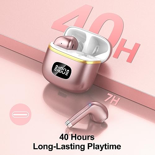 Bluetooth Headphones, 2023, Wireless Bluetooth 5.3 with HD Microphone, 40 Hours Playtime with LED Display, Deep Bass In Ear, IP7 Waterproof Earphones for Work, Study, Rose Gold