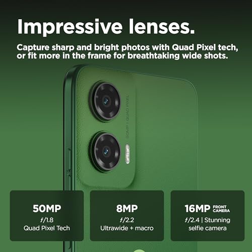 With a huge 6.72’’, FHD+ display, moto g35 5G brings your movies, games, and video calls to life even in bright light —backed by multidimensional Dolby Atmos on stereo speakers. Take breathtaking shots using the ultrawide lens, or capture sharp and bright photos in any light using the 50MP camera with Quad Pixel technology. Enjoy a ultrathin premium design, including an option in vegan leather. Unleash superfast 5G performance. And make sure the fun never stops with a long-lasting battery. moto g35 5G is made for big moments.